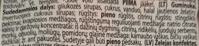 Sudėtis: kukurūzų krakmolas, želatina, stingdiklis pektinai, glajinės medžiagos: karnaubo vaškas, bičių vaškas.